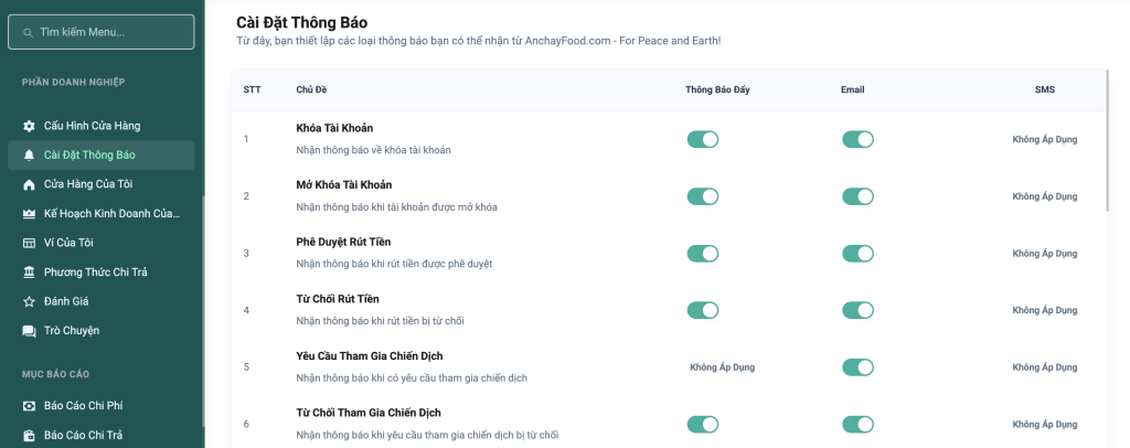 Bài viết này hướng dẫn bạn cách thiết lập các loại thông báo từ hệ thống AnchayFood để đảm bảo bạn không bỏ lỡ bất kỳ sự kiện quan trọng nào liên quan đến hoạt động kinh doanh của mình.