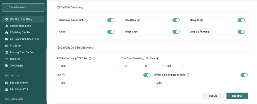 - Trong phần “Cài Đặt Cửa Hàng”, bạn có thể bật/tắt các dịch vụ mà cửa hàng cung cấp:
