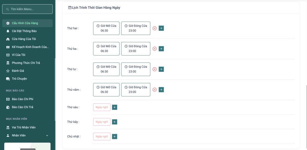Mục tiêu: Thiết lập giờ mở/closed cửa hàng và ngày nghỉ.