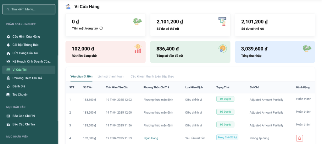 Bạn sẽ được chuyển đến trang “Ví Cửa Hàng”, nơi hiển thị thông tin tài chính của cửa hàng.