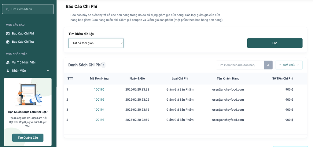 Khi nhấn vào mục này, bạn sẽ được chuyển đến trang Báo Cáo Chi Phí, nơi hiển thị danh sách các đơn hàng đã áp dụng giảm giá.