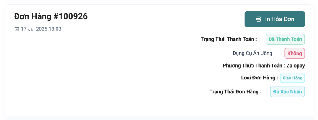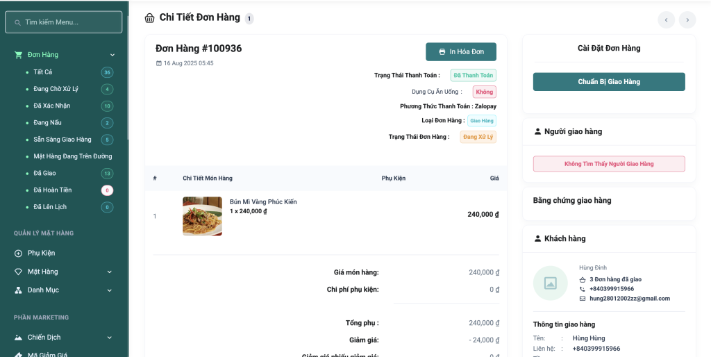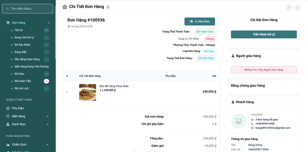 Trạng thái đơn hàng sẽ chuyển sang “Đang Xử Lý” → “Đang Nấu”.