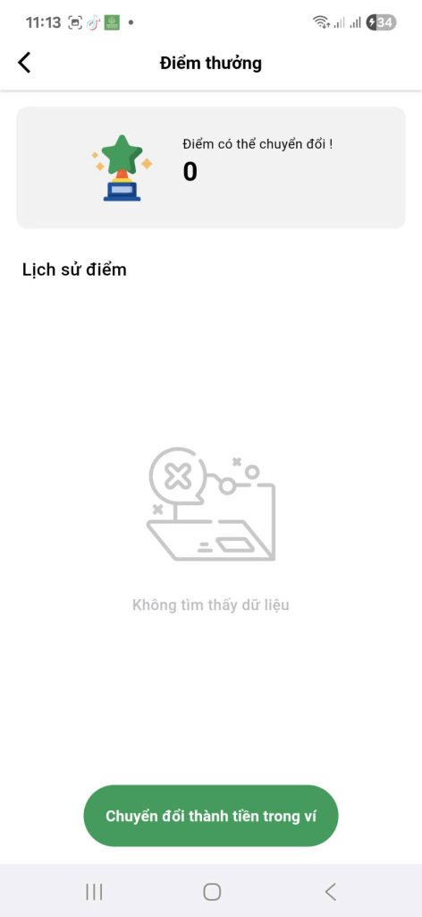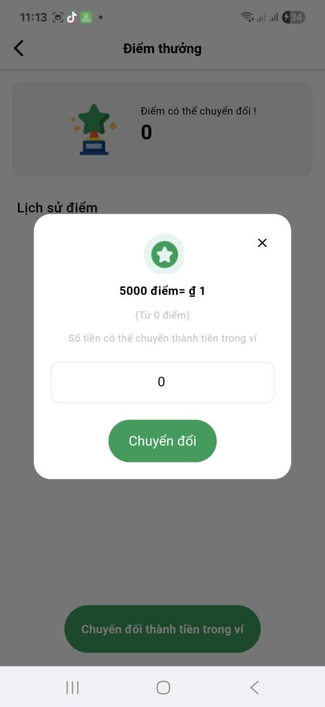 • Khi có đủ điểm, nhấn nút “Chuyển đổi” hoặc “Chuyển đổi thành tiền trong ví”.