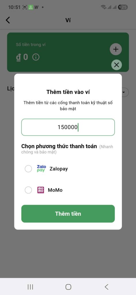 - Hệ thống sẽ chuyển đến màn hình “Thêm tiền vào ví”.