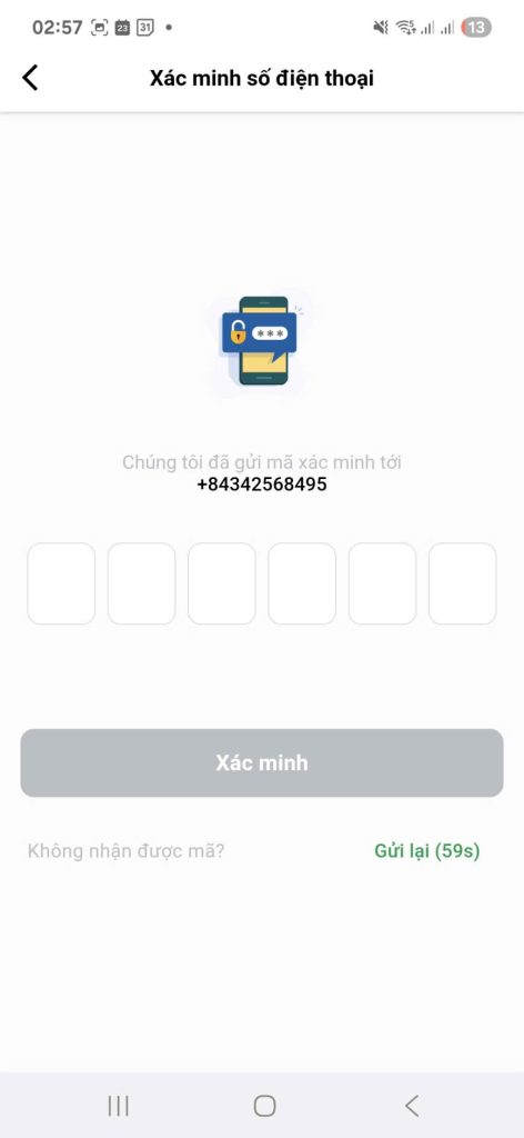 - Nếu không nhận được mã qua SMS, nhấn “Gửi lại (x giây)” để yêu cầu gửi lại.