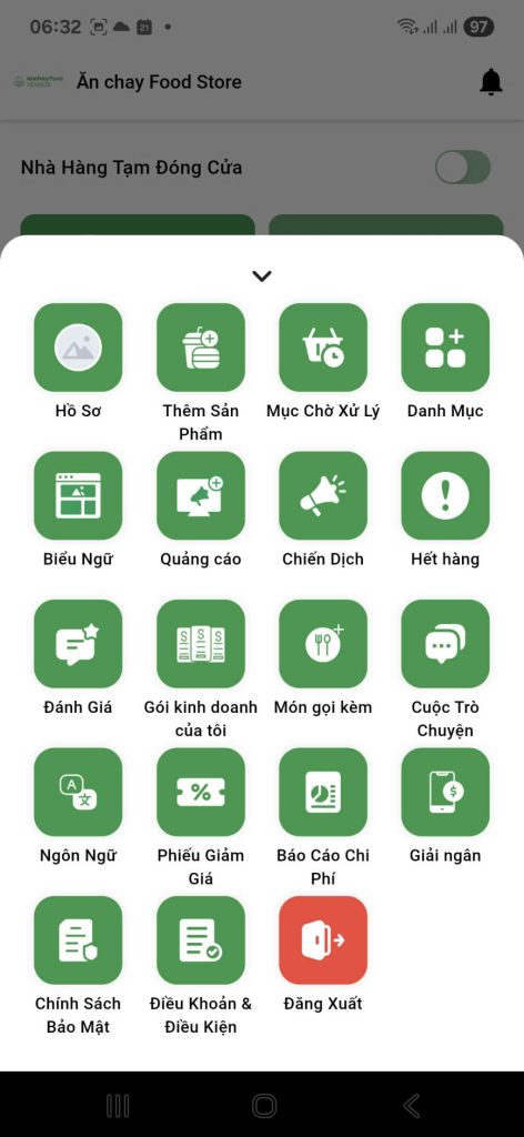 - Từ màn hình chính của ứng dụng dành cho Chủ cửa hàng/Quản lý, nhấn vào biểu tượng Menu (☰).