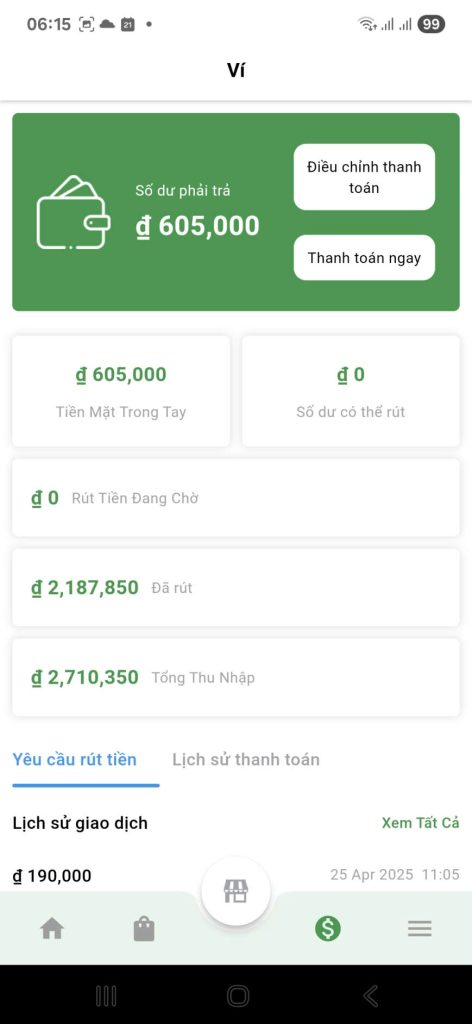 - Tiền Mặt Trong Tay (đ 605,000): Đây là số tiền mặt bạn đang giữ từ các đơn hàng “Thanh toán khi nhận hàng”. Về mặt lý thuyết, số tiền này phải khớp với số tiền bạn thực tế đã thu được.
