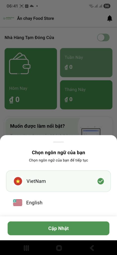 Kết luận: Tính năng cài đặt Ngôn Ngữ trên AnchayFood rất đơn giản nhưng vô cùng hữu ích, giúp việc quản lý cửa hàng trở nên linh hoạt và phù hợp với nhiều đối tượng người dùng khác nhau. Hãy chọn ngôn ngữ mà bạn cảm thấy thoải mái nhất để làm việc hiệu quả!