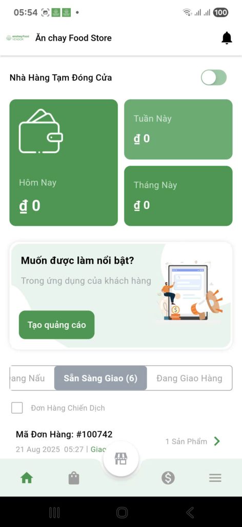 - Từ màn hình chính của ứng dụng dành cho Chủ cửa hàng/Quản lý, nhấn vào biểu tượng Menu (thường là ba dấu gạch ngang hoặc biểu tượng danh sách ☰).