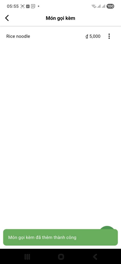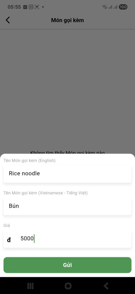 Rice noodle). Điều này có thể hữu ích nếu ứng dụng hỗ trợ đa ngôn ngữ.Tên Món gọi kèm (Vietnamese – Tiếng Việt): Nhập tên món bằng tiếng Việt (ví dụ:Bún). Đây là tên sẽ hiển thị chính cho khách hàng tại Việt Nam.Giá: Nhập giá tiền cho món gọi kèm này (ví dụ:5000). Hệ thống sẽ tự động thêm ký hiệu “đ” (đồng).
