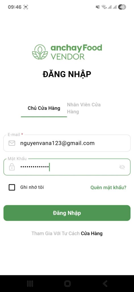 - Mở ứng dụng AnchayFood Vendor trên điện thoại (Android hoặc iOS).