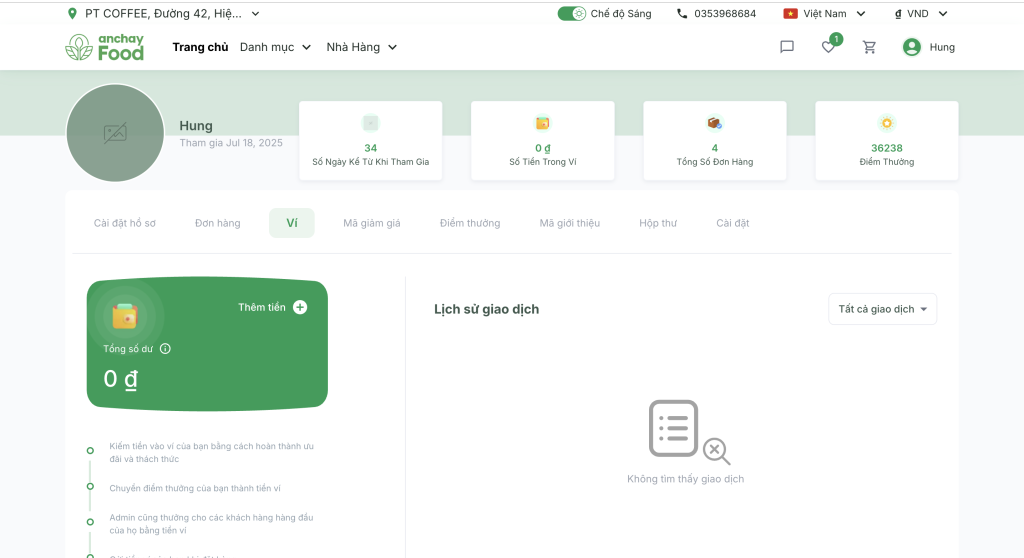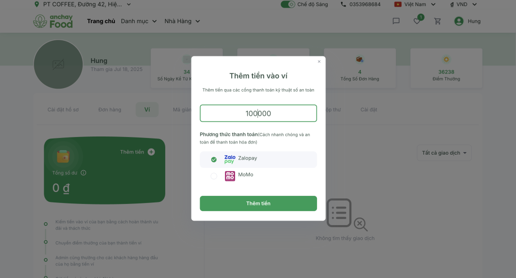 - Sau khi thanh toán thành công, tiền sẽ được tự động cộng vào ví AnchayFood của bạn ngay lập tức.
