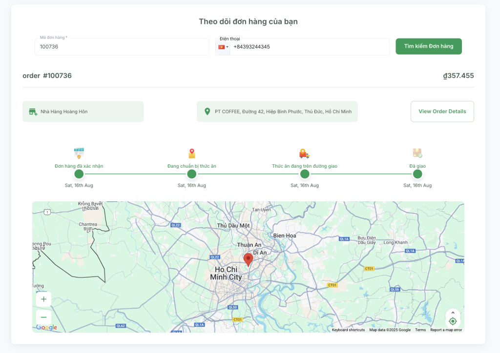 - Một bản đồ Google Maps sẽ hiển thị vị trí hiện tại của đơn hàng.