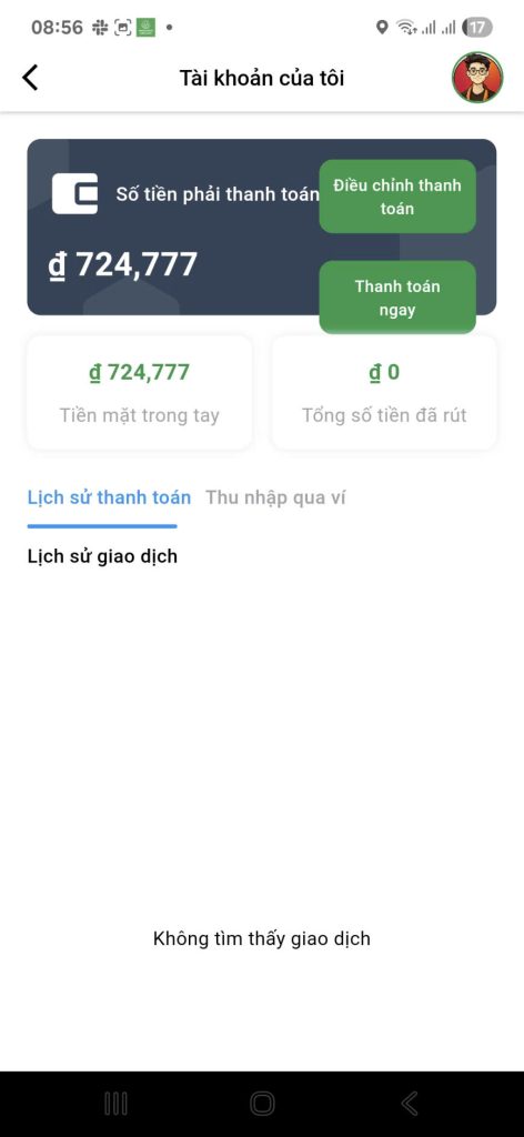 Tiền mặt trong tay: 724.777 VNĐ | Tổng tiền mặt bạn đã thu từ khách hàng trong các đơn hàng gần đây. |