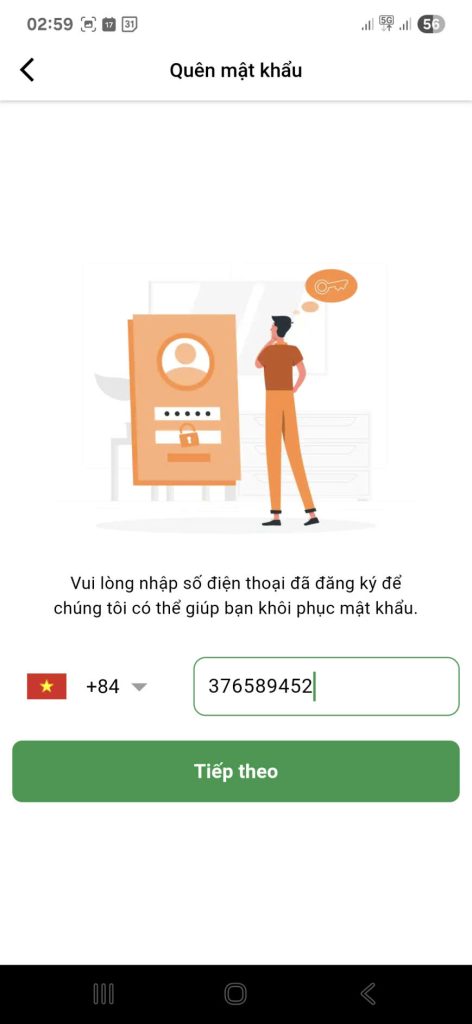 - Trên màn hình “Quên mật khẩu”, hãy nhập số điện thoại đã dùng để đăng ký tài khoản.